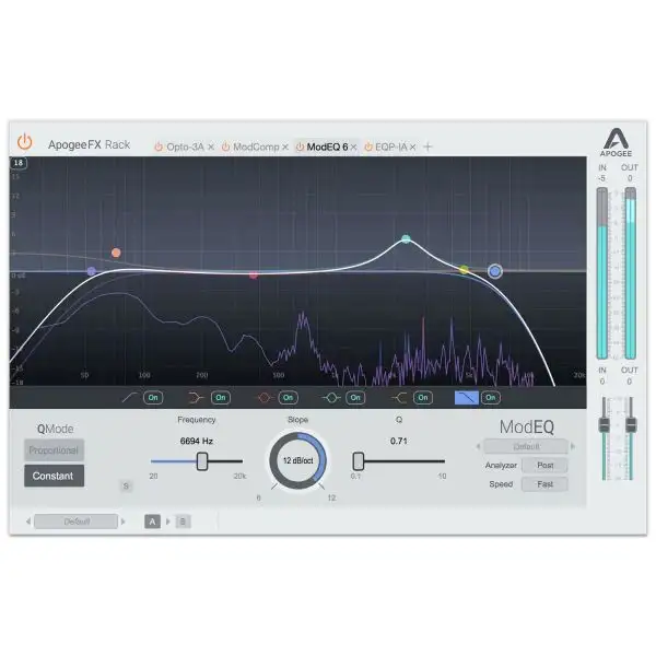 The Apogee FX Rack ModEQ 6 is a modern 6 band equalizer plug-in that is part of the Apogee FX Rack suite of plugins that runs natively in your favorite macOS DAW without any Apogee hardware but also has DualPath functionality that allows the plug-ins to run on Apogee Hardware DSP in Element Series and Ensemble Thunderbolt audio interfaces.