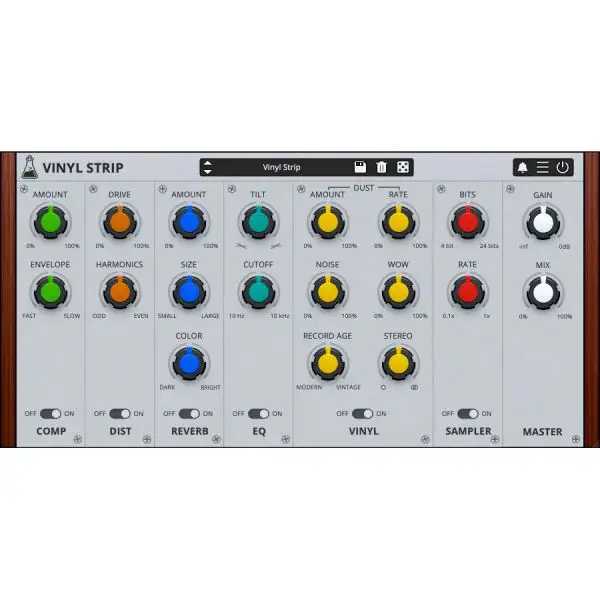 Much more than just a vinyl emulator, Vinyl Strip features 6 modules dedicated to recreating that classic vintage/old school sound of vinyl recording and sampling.