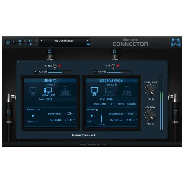 The Blue Cat Audio Connector is an audio & MIDI streaming plug-in that can be used to transmit audio and MIDI signals in real time between several computers or applications, or create your own routings within a single application, with minimal latency.