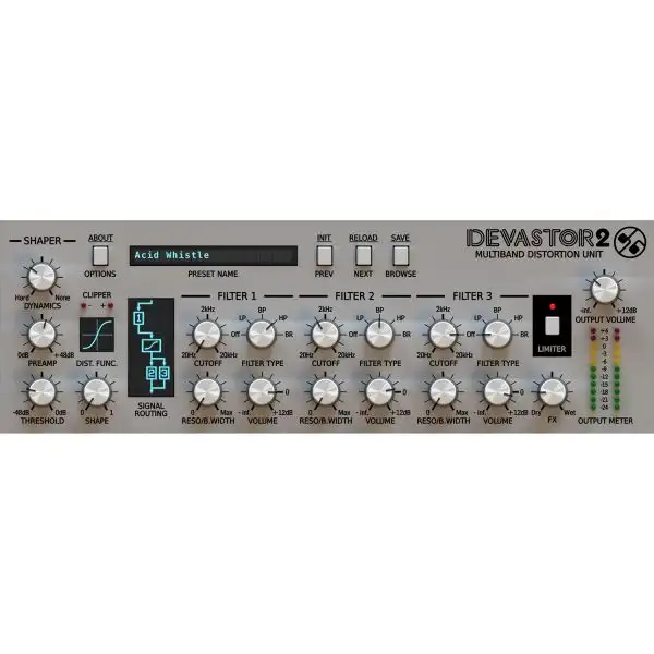 The D16 Group Devastor2 is the second generation of D16βs first FX plug-in from the SilverLine Collection series. Devastor is a deceptively simple yet remarkable Multiband Distortion Unit. It is an enhanced version of the distortion unit you can find in Phoscyon, but with full control over multiband processing. This elevates its sonic mangling capabilities to an entirely new level!