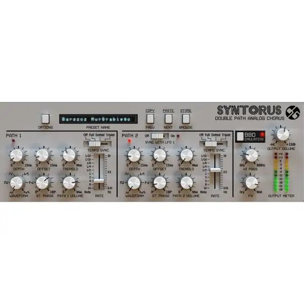 Syntorus also has an emulation of a Bucket-Brigade Device (BBD) analog delay line included within its architecture. Turning this on, will add extra analog warmth and character to the audio signal. With BBD off, Syntorus functions as an exceptional high quality chorus effect unit where the spectrum of the sound is clean and pristine.