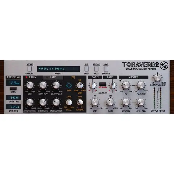Toraverb also has an additional modulation parameter, which affects the diffusing network. These are responsible for the distribution of the sound waves reflections in time. By changing the modulation, the sound of the reverb tail can be altered to give a more realistic effect of sound propagation. Modulation amount is controlled independently for early and late reflections.