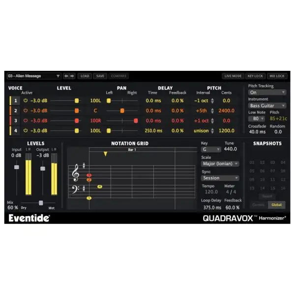 Eventide Quadravox is a unique composition tool designed to inspire songwriting, stack harmonies, widen instruments and offers creative innovative rhythmic sequences. With Quadravox, you can take any incoming tones, including drums, and generate up to four voices based on the chosen key and timing interval. Itβs optimized for multiple instances so your tracks can interact with each other by way of beautiful harmonies and groovy sequences.