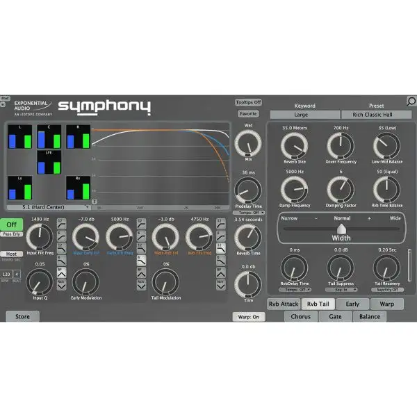 The Exponential Audio Symphony Reverb is a lush, colorful reverb engine gets a multichannel upgrade in Symphony. Offering support for up to 7.1 surround, Symphony delivers a rich, character-filled reverb tone for any music or post production project. With channel-specific Balance controls and an expanded Warp section with Compression and Overdrive modules, Symphony takes the creative power of R2 Surround and R4 and pushes it even further.