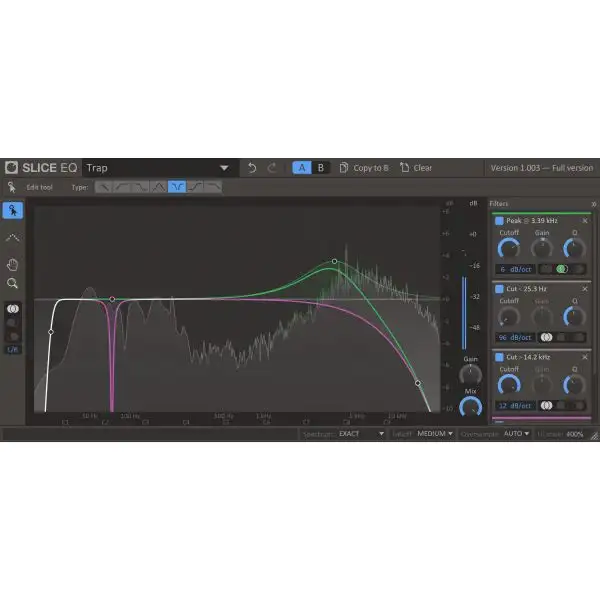 Kilohearts Slice EQ is a truly modern parametric equalizer, Slice EQ cuts, or enhances, frequencies with surgical precision using razor-sharp digital filters up to 96 dB/oct.