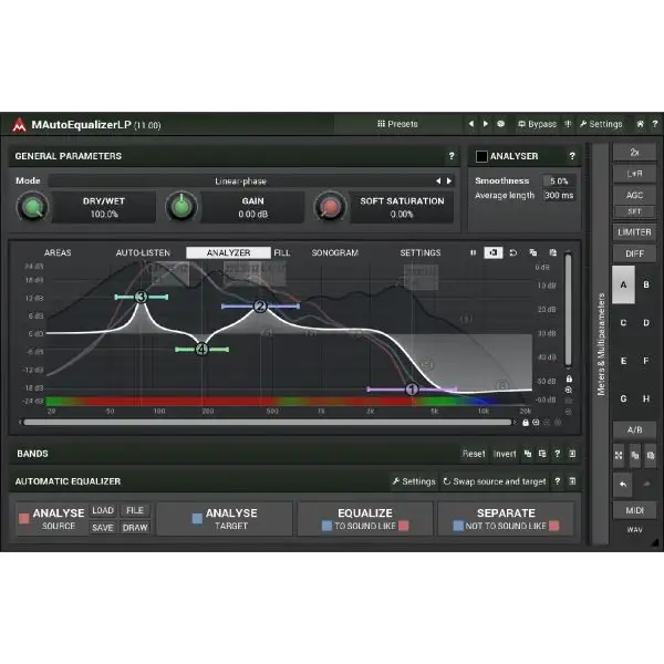 Analyze your track, select what you want it to sound like and let the plug-in do the magic. It will set up the equalizer bands for you! Unlike traditional spectral matching, here you have no latency and amazing sound quality!