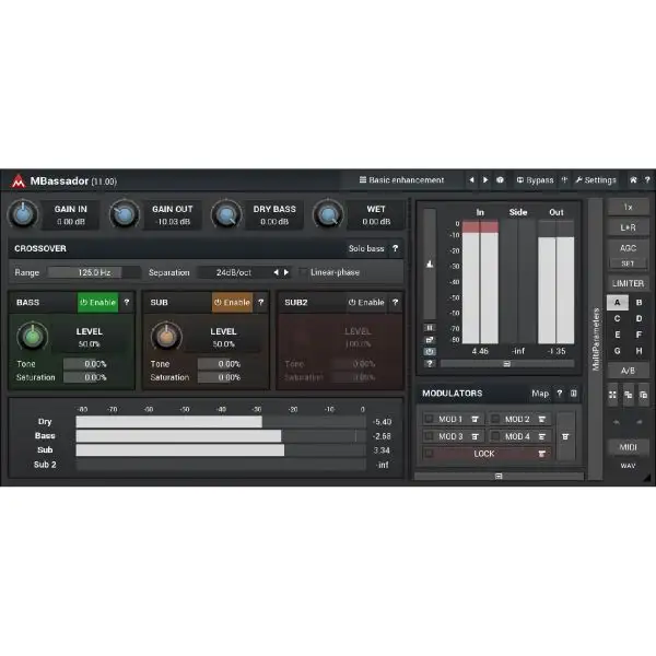 Not many people have the access to the studio equipment professionals use when mixing. That’s especially true when it comes to reproducing bass and subbass spectrum. The first module in MBassador lets you post-process the bass content so that it is stable and tight and contains higher harmonics, so that it is audible even when played on a cheap pair of headphones so many listeners use these days.
