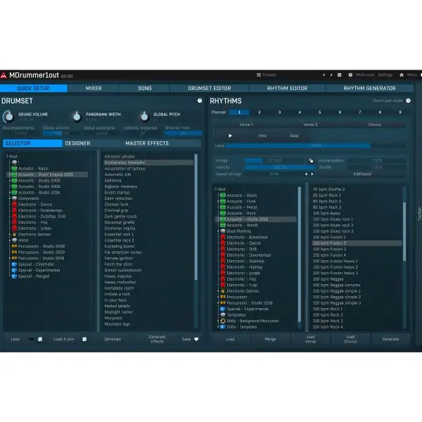 MDrummer truly understands what a rhythm is in the same way that humans do and you have access to everything it knows. It can cover any style and any percussive instrument. MDrummer can play pop, drum’n’bass, rock, r’n’b, salsa, jungle, jazz, rumba on congas, progress-metal in 11/4 signature… anything you can imagine. MDrummer can generate new rhythms for you, merge multiple rhythms, add shakers and other background percussion. Humanization, shuffling, half/double tempo & feel and many more advanced features let you transform your ideas into reality with a few mouse clicks.