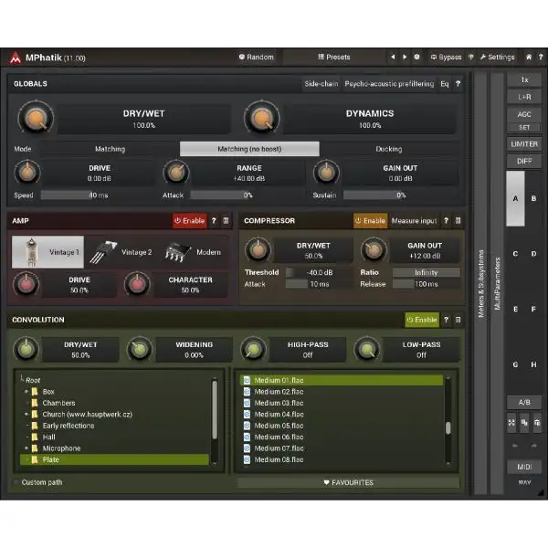MeldaProduction MPhatik is a unique dynamic multi-effect featuring an amp, convolution and a compressor, which lets you warm up your audio and then restore the original dynamics. And that’s just the beginning without even starting to get creative.