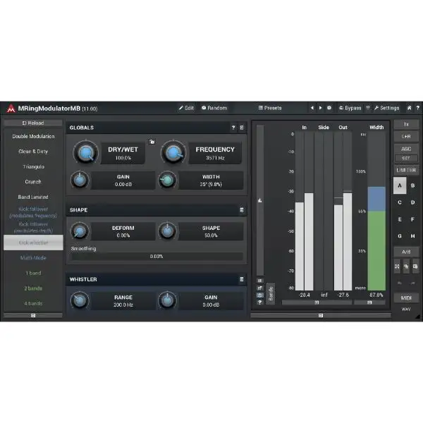Ring-modulators are quite specialized effects used especially on non-harmonic audio materials, such as drums. MeldaProduction MRingModulatorMB is a very advanced ring-modulation effect, which is, due to its multi-band nature, highly suitable for many types of audio.