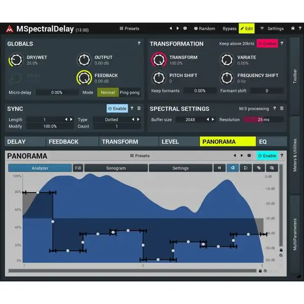 Traditional delay plug-ins feature a simple feedback delay, which produces identical copies of the original signal, sometimes with a possibility of filtering, distortion or other basic effects. MSpectralDelay lets you transform individual frequencies. First it lets you control the delay time, feedback, panorama and level (EQ) for each frequency. MSpectralDelay also provides complex spectral transformations – pitch, frequency shift, formants, plus an actual frequency to frequency transformation and level to level transformation.