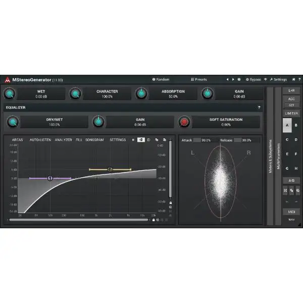 An integrated equalizer lets you adjust which parts of the spectrum you want to expand and the stereo scope gives you an immediate view of the resulting stereo width.