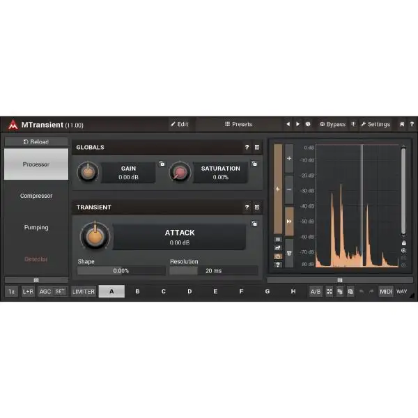 The plug-in can not only bring the transients up and down, it can make them more textural using our magnificent saturation system, which can add a pleasant analog character.