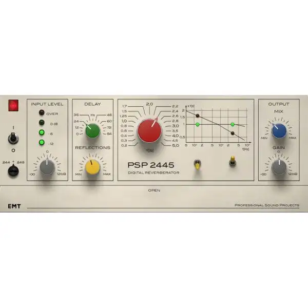 The PSP Audioware 2445 EMT is a reverb processor plug-in (VST, AAX and RTAS for Windows; AudioUnit, VST, AAX and RTAS for Mac OSX) inspired by two legendary early digital age reverberators: the EMT 244 and the EMT 245. PSP thoroughly researched how to bring the specific features of those simple, yet very musical sounding reverbs to life as a plug-in. PSP then improved from the originals with a handy set of parameters to control details of the sound and mix the reverb not available in the original hardware. The PSP 2445 is capable of processing using one selected engine or both of them simultaneously.