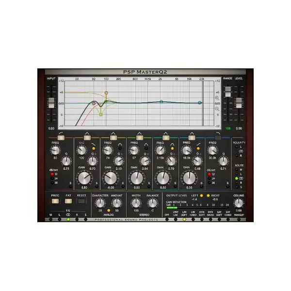 MasterQ2 can operate at sampling rates ranging from 44.1 to 192 kHz. It offers seven filters: 12, 24, and 36 dB/oct low cut and high cut filters; low shelf and high shelf filters which can be switched to peaking filters; and low-mid, middle and high-mid peaking filtersβ all with adjustable frequency and Q over a wide range. The EQ graph displays an overview of the EQ curve, as well as the individual characteristics of each filter. In addition to its powerful filters, PSP MasterQ2 also offers you a selection of limiting and “soft- clipping” algorithms to help you shape your signal and keep it from digitally peaking.