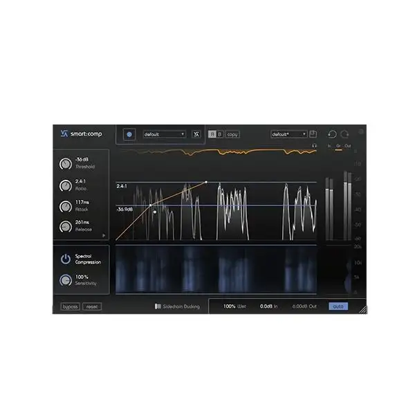Frequency-dependent ducking in sidechain mode seamlessly merges signals that compete for attention within the same spectral regions. smart:comp βlistensβ for potential spectral clashes and dynamically ducks affected frequency regions of the input signal.
