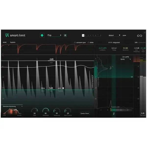 Sonible smart:limit is all about worry-free limiting: Its intelligent processing will preserve the detail of your track and provide a transparent, uncompromising limiting quality. With smart:limit’s extensive loudness and dynamics monitoring, you wonβt have to use any additional metering plug-ins. Besides providing you with all the necessary loudness information in real-time for confident publishing, smart:limit guides you towards hitting the safe zone requirements of streaming platforms or loudness standards β and gives you feedback via interactive Quality Check hints.