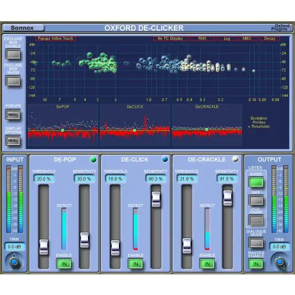 The Sonnox Oxford DeClicker has three main sections: DePop, DeClick and DeCrackle. These three sections deal with events that are up to 10ms, 3ms and 0.4ms in duration, respectively. Each of these sections has a threshold and sensitivity control, and an excitation profile which shows the residual signal left after harmonic content is removed. The excitation profile represents how much the signal deviates from the predicted signal.