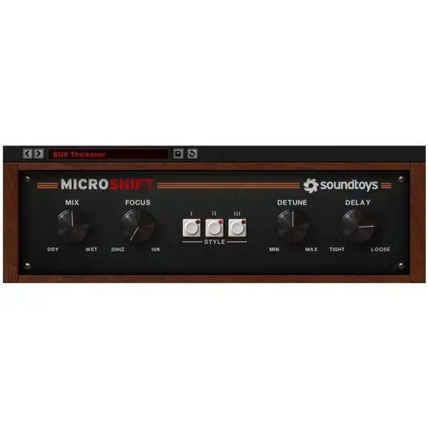Need some width for your background vocals? Want to make a lead guitar or synth sound larger than life? Soundtoys MicroShift 5 gives you three different flavors of a classic stereo widening trick at the push of a button. It uses a special recipe of pitch shifting, and delay that varies over time, to create rich stereo width. Itβs incredibly simple to use and perfect for spicing up important instruments, or for blending background vocals subtly into a mix.