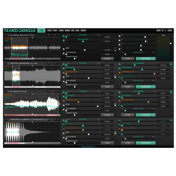 The technology behind Transformizer, is based on advanced analyses of the pitch, amplitude, duration, and timbre of a sound. Under the hood is advanced and patented DSP coding with solutions for interpolation, alteration, and enhancement of various spectral elements of a sound, all mixed out in a mixed stereo output or 4 separate stereo outputs. The Randomizer function presents thousands of sonic nuances by blending sounds and keeping their original βDNAβ, using this unique approach. You can also go completely nuts with Transformizer and create sounds that you have never heard before β backward playback, separate tempos of the 4 sections, single out specific parts of a sound and loop it in instant sync, speed it up, pitch it down 60 semitones, etc.