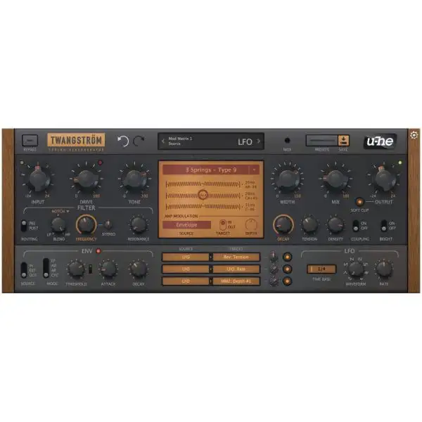 The u-He Twangstrรถm is a flexible spring reverb box-of-tricks. If you’re familiar with Bazille, you might already have come across its built-in spring unit. u-He took that one, then modeled two more reverb tanks, paired it with drive section, filter stage, envelope, and mod matrix. It emulates a hand-picked selection of the most popular units you will find in classic guitar and instrument amplifiers, recreating the odd character of real springs.