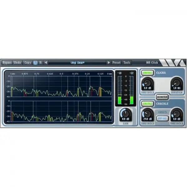Wave Arts MR Click combines click and crackle filtering for cleanup of phonograph recordings or other impulsive contamination. MR Click has separate processors for clicks and crackles because of the different nature of the contaminants. The term βclickβ here means a large disturbance, such as caused by a phonograph scratch or a splice in a digital signal. The click processor automatically detects clicks and reconstructs the audio signal in the neighborhood of the click to eliminate it. βCrackleβ means the high frequency scratchiness you get from dust or wear in the grooves of a phonograph. The crackle processor automatically detects crackle and eliminates it by smoothing the signal in the neighborhood of the crackle event. The crackle processor also contains an onset detector that will inhibit de-crackling the onset of events like snare hits or cymbal crashes.